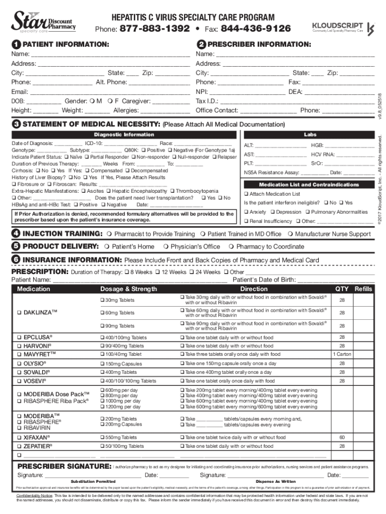 HEPATITIS C VIRUS SPECIALTY CARE PROGRAM Phone: 8778831392 Fax: 8444369126 2 PRESCRIBER INFORMATION:Name: Address: City: State: Zip: Phone: Alt. Phone: Email: DOB: Gender: M F Caregiver: Height: Weight: