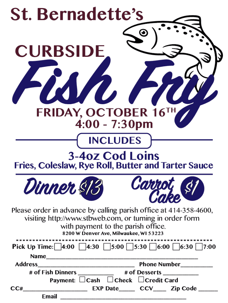 St. BernadettesFish FryCURBSIDEFRIDAY, OCTOBER 16TH 4:00 7:30pm INCLUDES34oz Cod LoinsFries, Coleslaw, Rye Roll, Butter and Tarter SauceCarrot $1 Cake Dinner $13Please order in advance by calling