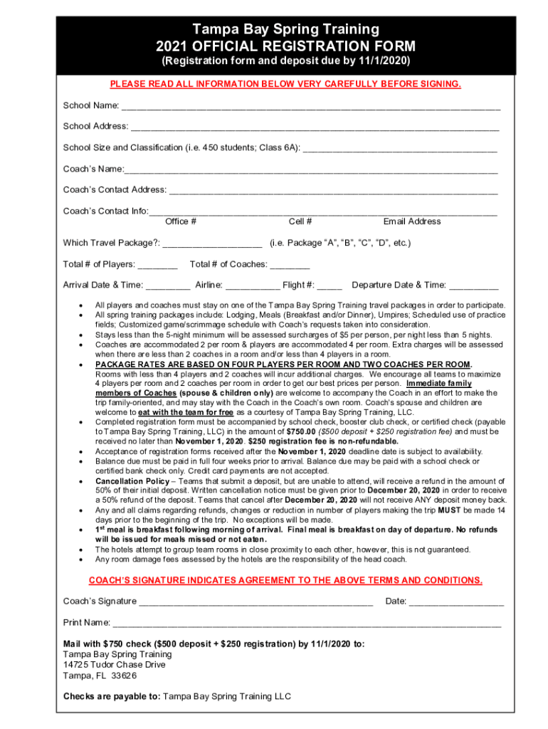 Tampa Bay Spring Training 2021 OFFICIAL REGISTRATION FORM (Registration form and deposit due by 11/1/2020)PLEASE READ ALL INFORMATION BELOW VERY CAREFULLY BEFORE SIGNING. School Name: School Address: