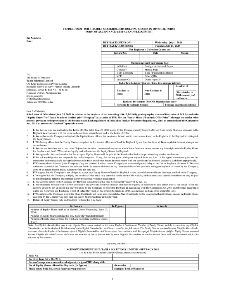 Get the free TENDER FORM (FOR ELIGIBLE SHAREHOLDERS HOLDING SHARES IN ...