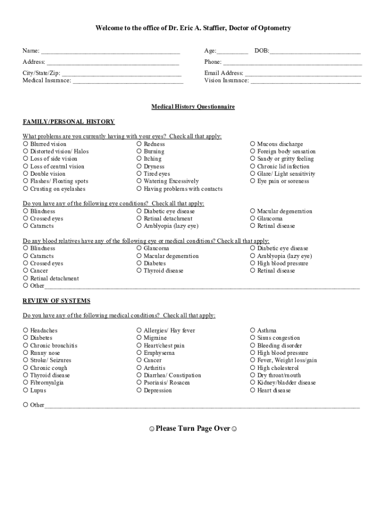 Welcome to the office of Dr. Eric A. Staffer, Doctor of Optometry Name: Age: DOB: Address: Phone: City/State/Zip: Medical Insurance: Email Address: Vision Insurance: Medical History Questionnaire