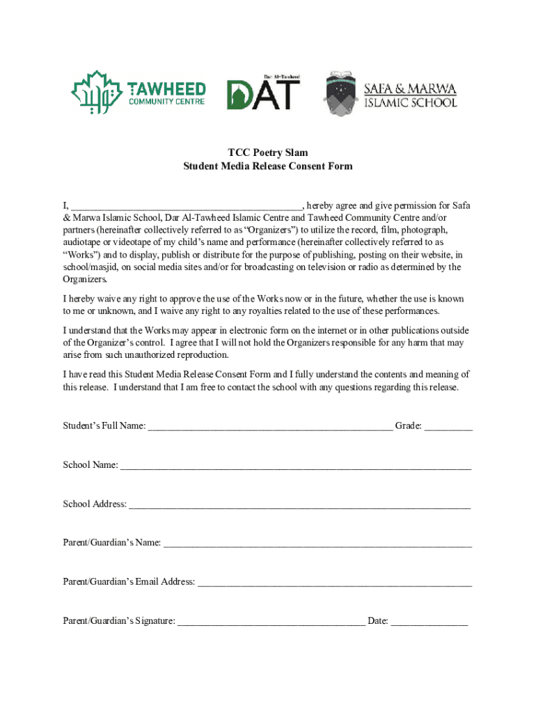 TCC Poetry Slam Student Media Release Consent Form, hereby agree and give permission for Safe & Maria Islamic School, DAR Attached Islamic Center and Tweed Community Center and/or partners (hereinafter