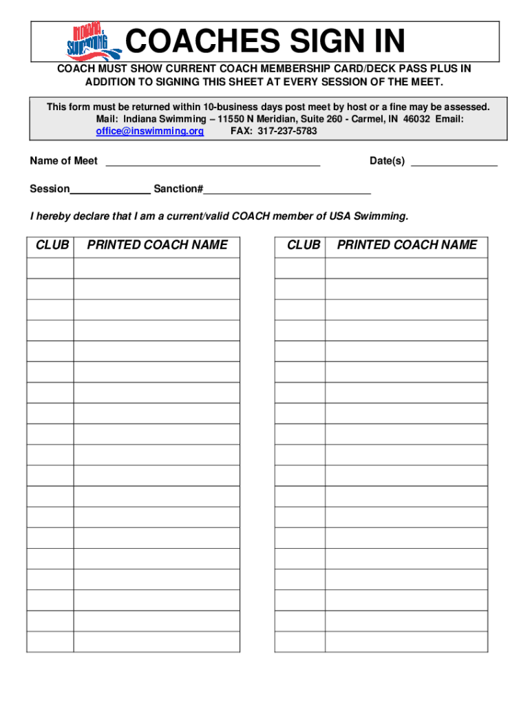 COACHES SIGN IN COACH MUST SHOW CURRENT COACH MEMBERSHIP CARD/DECK PASS PLUS IN ADDITION TO SIGNING THIS SHEET AT EVERY SESSION OF THE MEET. This form must be returned within 10business days post