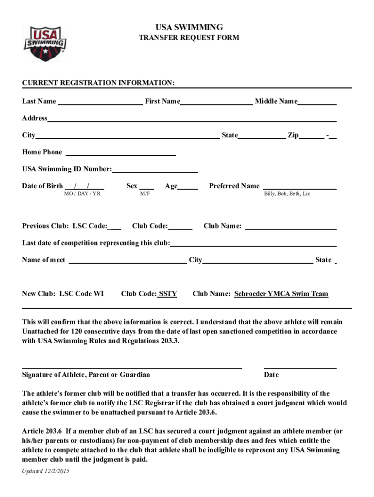 USA SWIMMING TRANSFER REQUEST CONCURRENT REGISTRATION INFORMATION: Last NameFirst NameMiddle Headdress CityStateZipHome Phone USA Swimming ID Number: Date of Birth / / MO / DAY / Previous Club: LSC