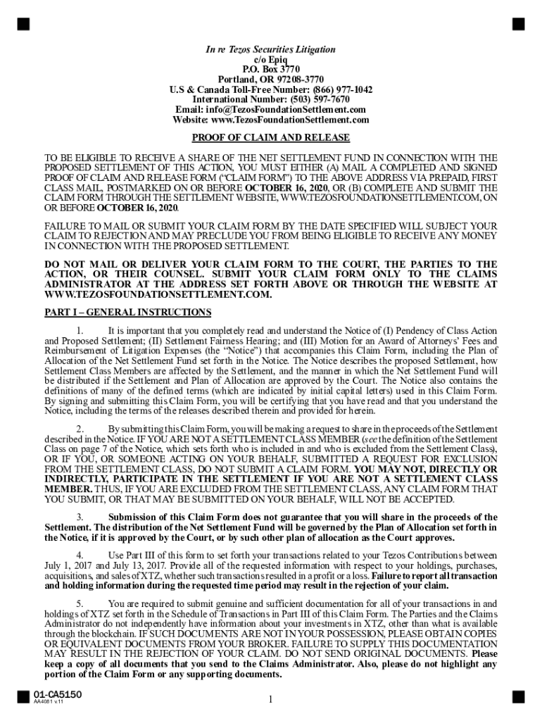 Get the free In re Tezos Securities Litigation c/o Epiq Portland, OR 97208 ...