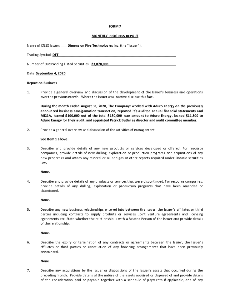 Name of CNS Issuer:Dimension Five Technologies Inc. (the Issuer). Trading Symbol: DFT