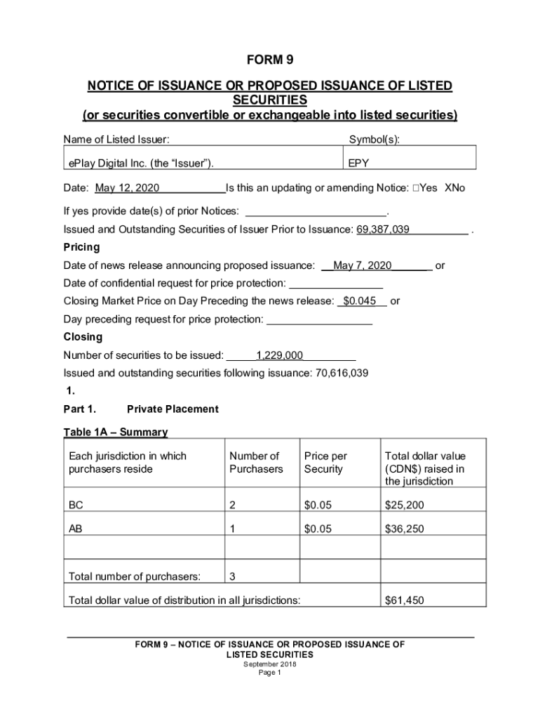 FORM 9 NOTICE OF ISSUANCE OR PROPOSED ISSUANCE OF LISTED SECURITIES (or securities convertible or exchangeable into listed securities) Name of Listed Issuer:Symbol(s):play Digital Inc. (the Issuer).