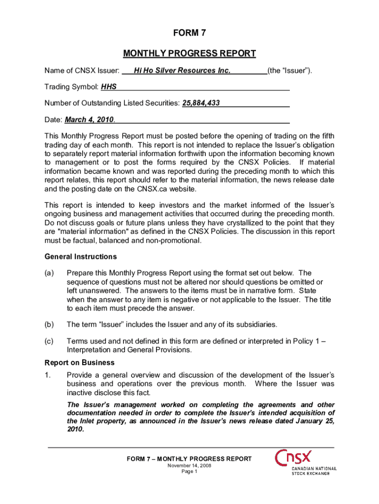 Name of CNS Issuer:Hi Ho Silver Resources Inc.(the Issuer). Trading Symbol: HHS