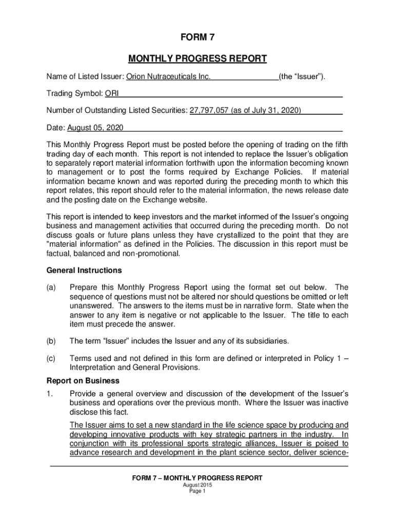 Name of Listed Issuer: Orion Nutraceutical Inc.(the Issuer). Trading Symbol: ORI