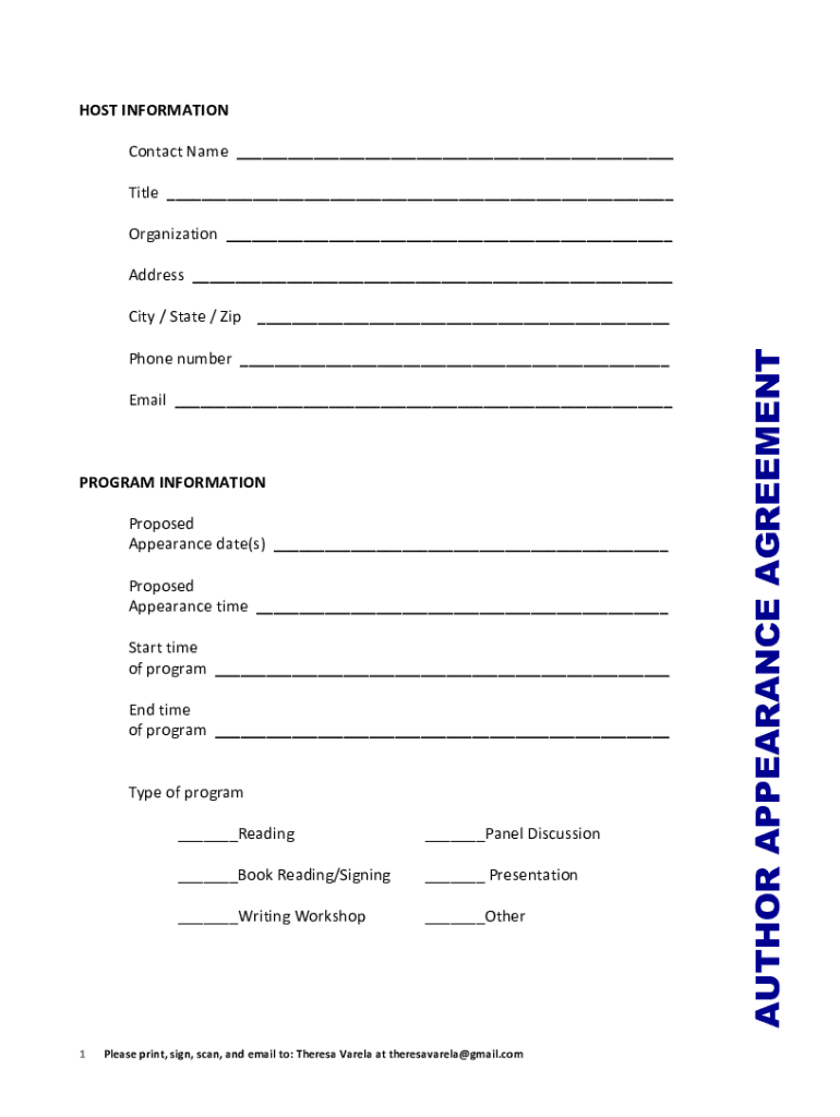 Obtain the necessary form for author appearance, which can be typically found on the publisher's website or requested from the event organizer.