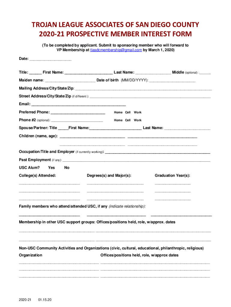 TROJAN LEAGUE ASSOCIATES OF SAN DIEGO COUNTY 202021 PROSPECTIVE MEMBER INTEREST FORM (To be completed by applicant. Submit to sponsoring member who will forward to VP Membership at tlasdcmembership