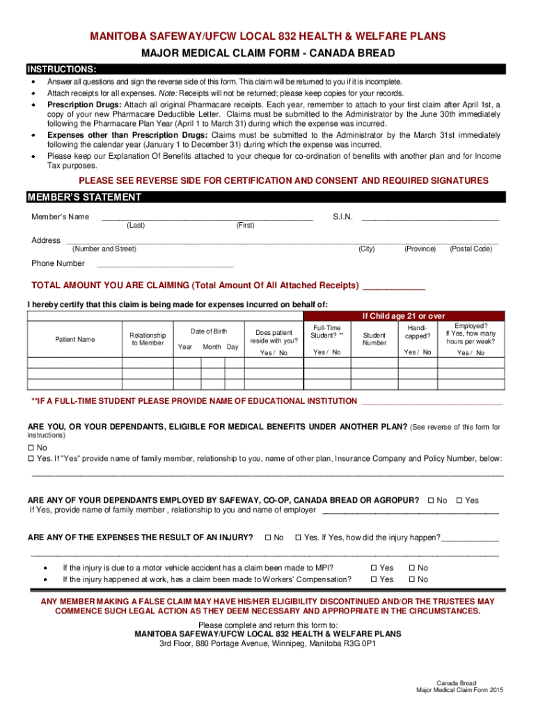MANITOBA SAFEWAY/FCW LOCAL 832 HEALTH & WELFARE PLANS MAJOR MEDICAL CLAIM FORM CANADA BREAD INSTRUCTIONS: Answer all questions and sign the reverse side of this form. This claim will be returned to