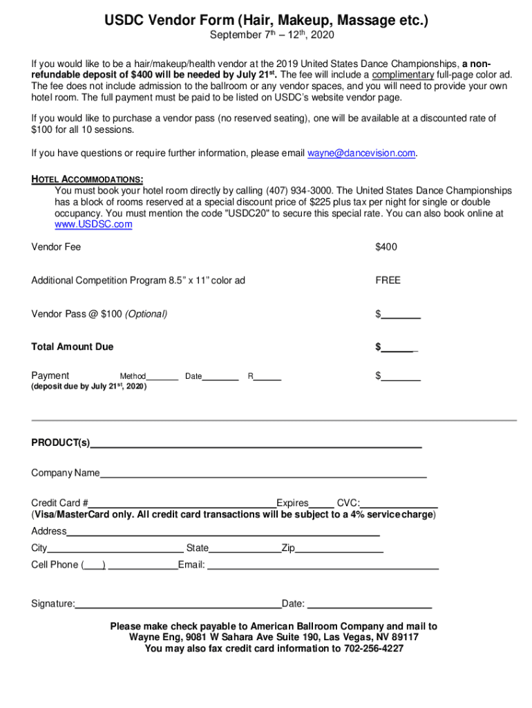 USDA Vendor Form (Hair, Makeup, Massage etc.) September 7th 12th, 2020If you would like to be a hair/makeup/health vendor at the 2019 United States Dance Championships, a nonrefundable deposit of