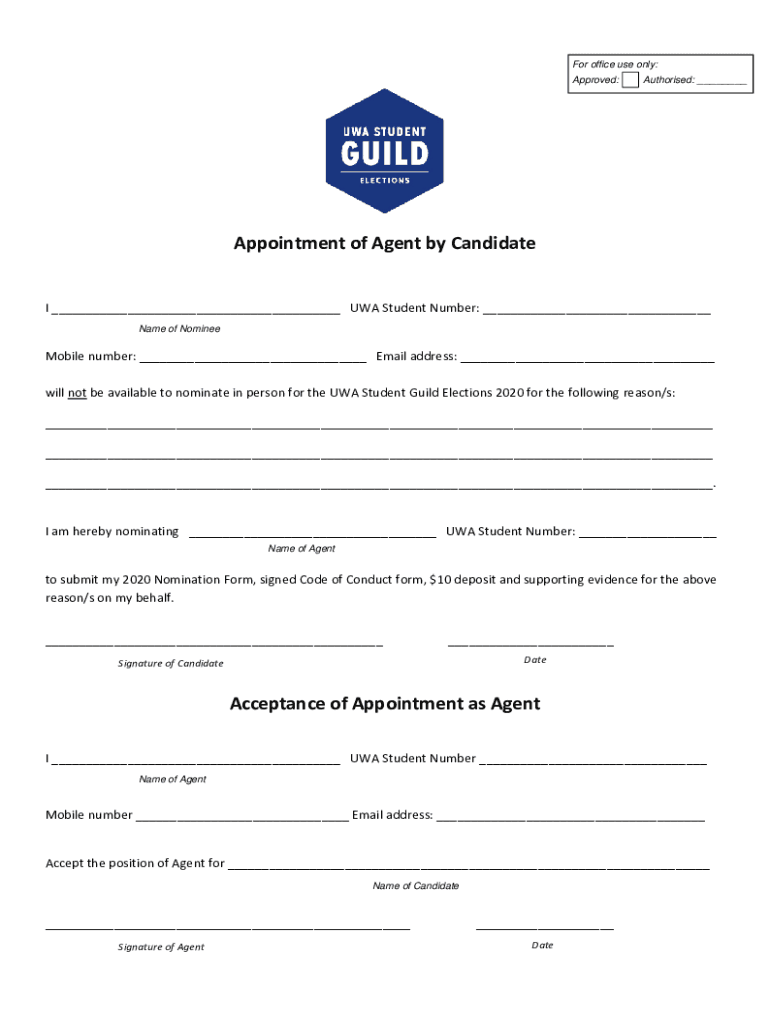 For office use only: Approved:Authorized: AppointmentofAgentbyCandidate I UWAStudentNumber: Name of NomineeMobilenumber: Email address: willnotbeavailabletonominateinpersonfortheUWAStudentGuildElections2020forthefollowingreason/s:.
