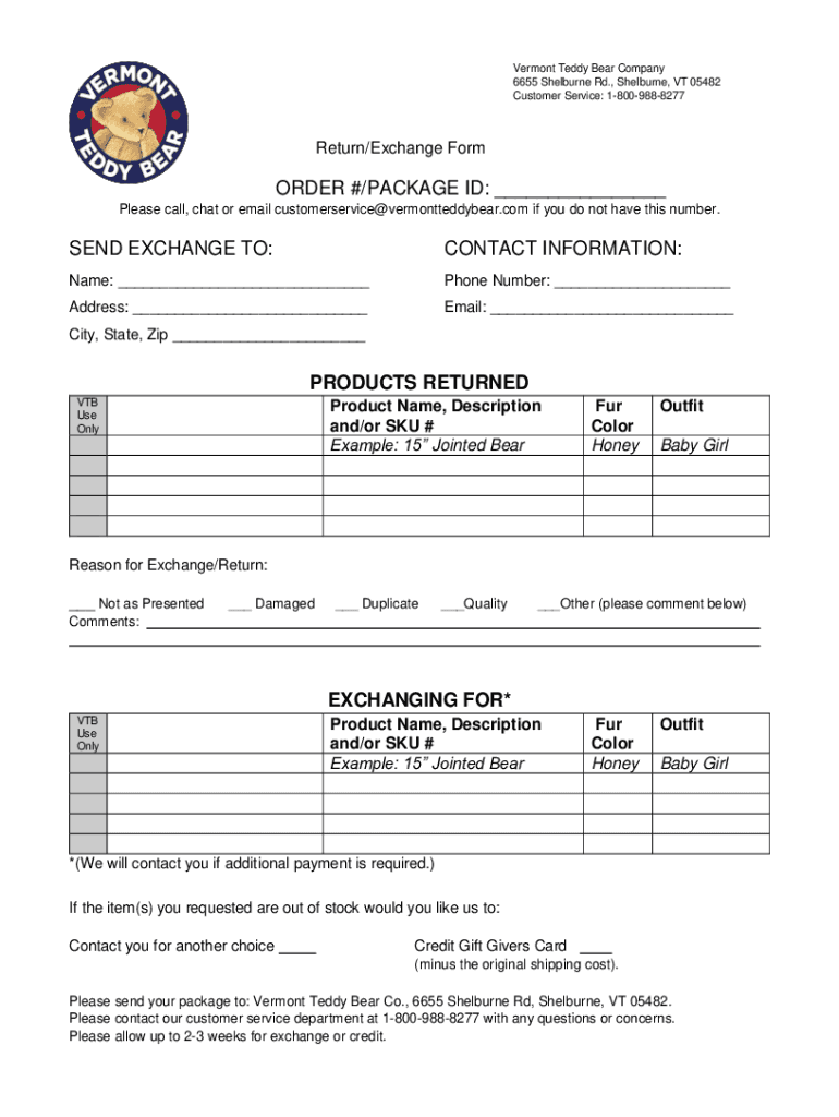 Vermont Teddy Bear Company 6655 Melbourne Rd., Melbourne, VT 05482 Customer Service: 18009888277Return/Exchange Forwarder #/PACKAGE ID: Please call, chat or email customer service vermontteddybear.com