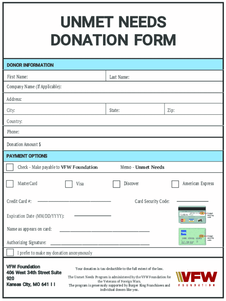 UNMET NEEDS DONATION FORM DONOR INFORMATIONFirst Name:Last Name:Company Name (If Applicable): Address: Zip:State:City: Country: Phone: Donation Amount $ PAYMENT OPTIONSDCheck Make payable to VFW FoundationDMasterCardCredit