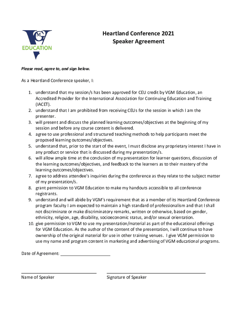Speaker AgreementPlease read, agree to, and sign below. As a Heartland Conference speaker, I: