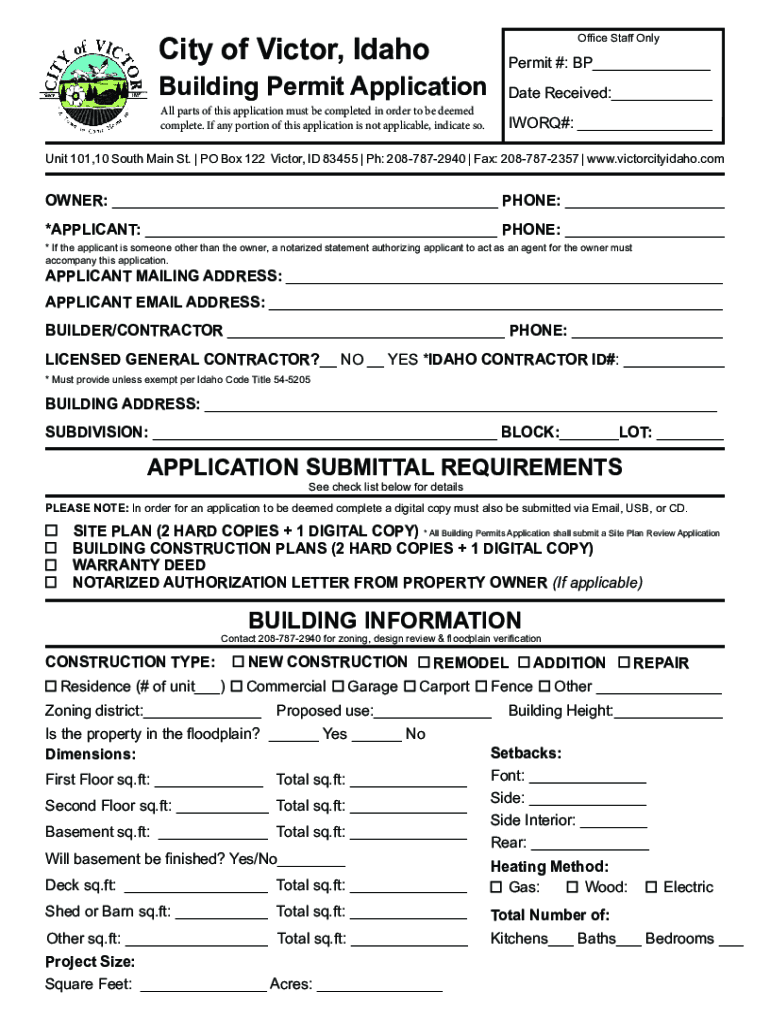 City of Victor, IdahoOffice Staff OnlyPermit #: BP Building Permit ApplicationDate Received: All parts of this application must be completed in order to be deemed complete. If any portion of this