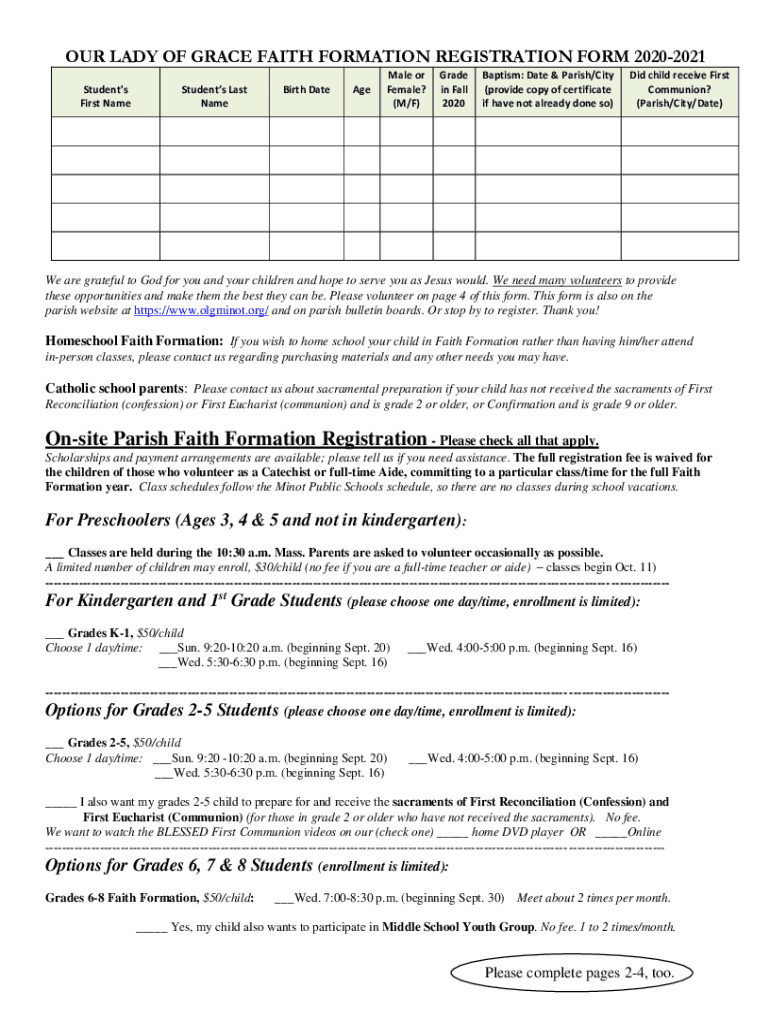OUR LADY OF GRACE FAITH FORMATION REGISTRATION FORM 20202021 Students First NameStudents Last Rebirth DateAgeMale or Female? ’M/F)Grade in Fall 2020Baptism: Date & Parish/City (provide copy of certificate