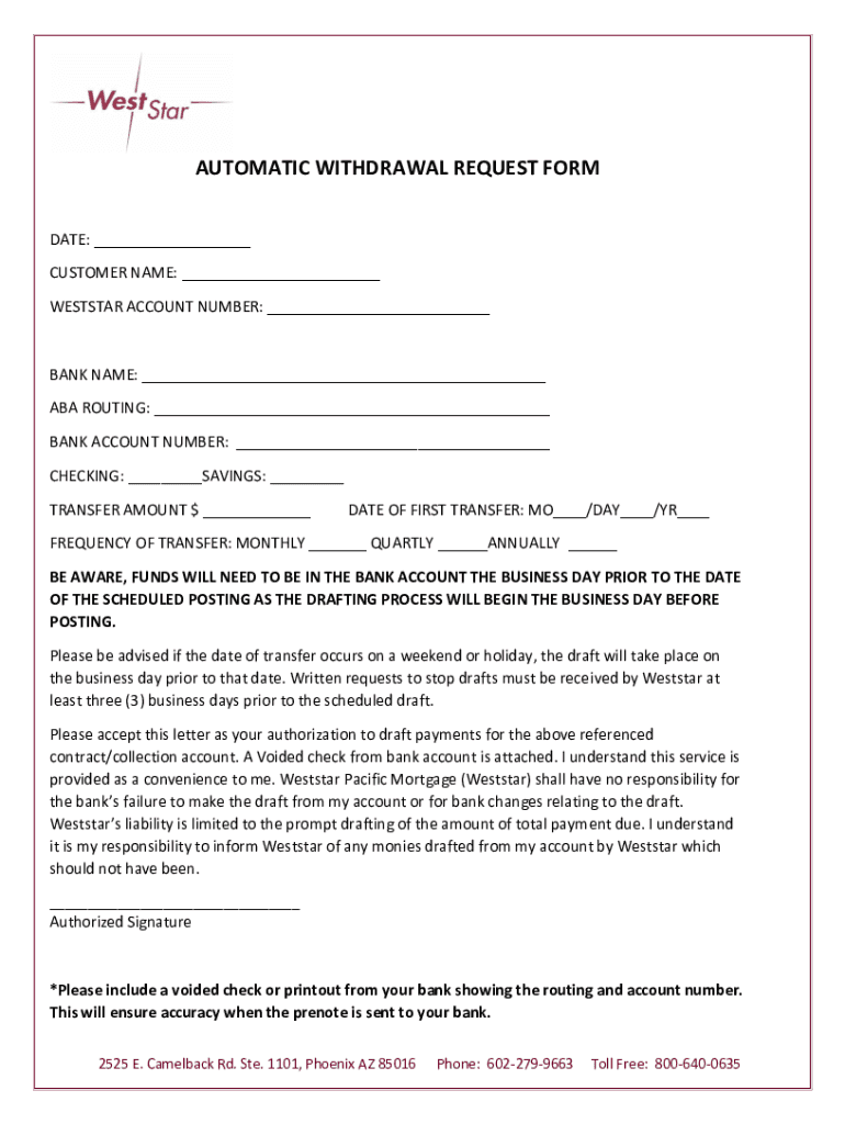 AUTOMATIC WITHDRAWAL REQUEST FORM DATE: CUSTOMER NAME: WEST STAR ACCOUNT NUMBER: BANK NAME: ABA ROUTING: BANK ACCOUNT NUMBER: CHECKING: SAVINGS: TRANSFER AMOUNT $ DATE OF FIRST TRANSFER: MO /DAY /YR