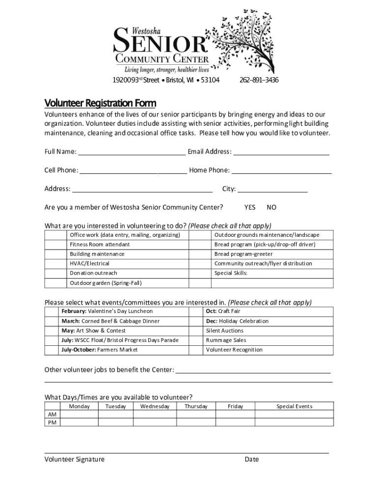 1920093rd Street Bristol, WI 531042628913436Volunteer Registration Form Volunteers enhance of the lives of our senior participants by bringing energy and ideas to our organization. Volunteer duties