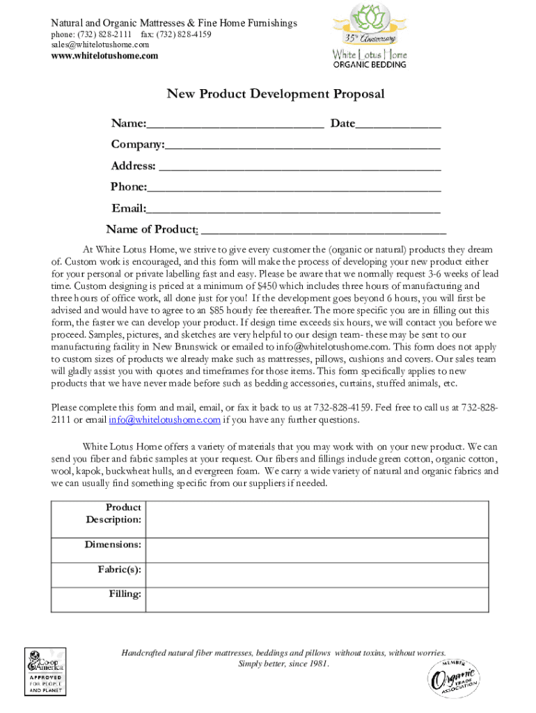 Natural and Organic Mattresses & Fine Home Furnishings phone: (732) 8282111 fax: (732) 8284159 sales whitelotushome.come.whitelotushome.come Product Development Proposal Name: Date Company: Address: