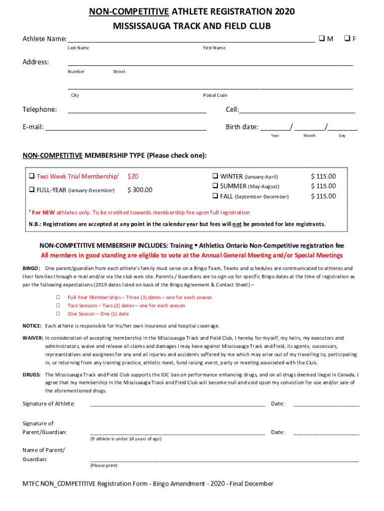 NONCOMPETITIVE ATHLETE REGISTRATION 2020 MISSISSAUGA TRACK AND FIELD CLUB Athlete Name: M Last Headdress:First Name NumberStreet CityTelephone:Postal Code Cell: Email: Birth date: / / YearMonthDayNONCOMPETITIVE