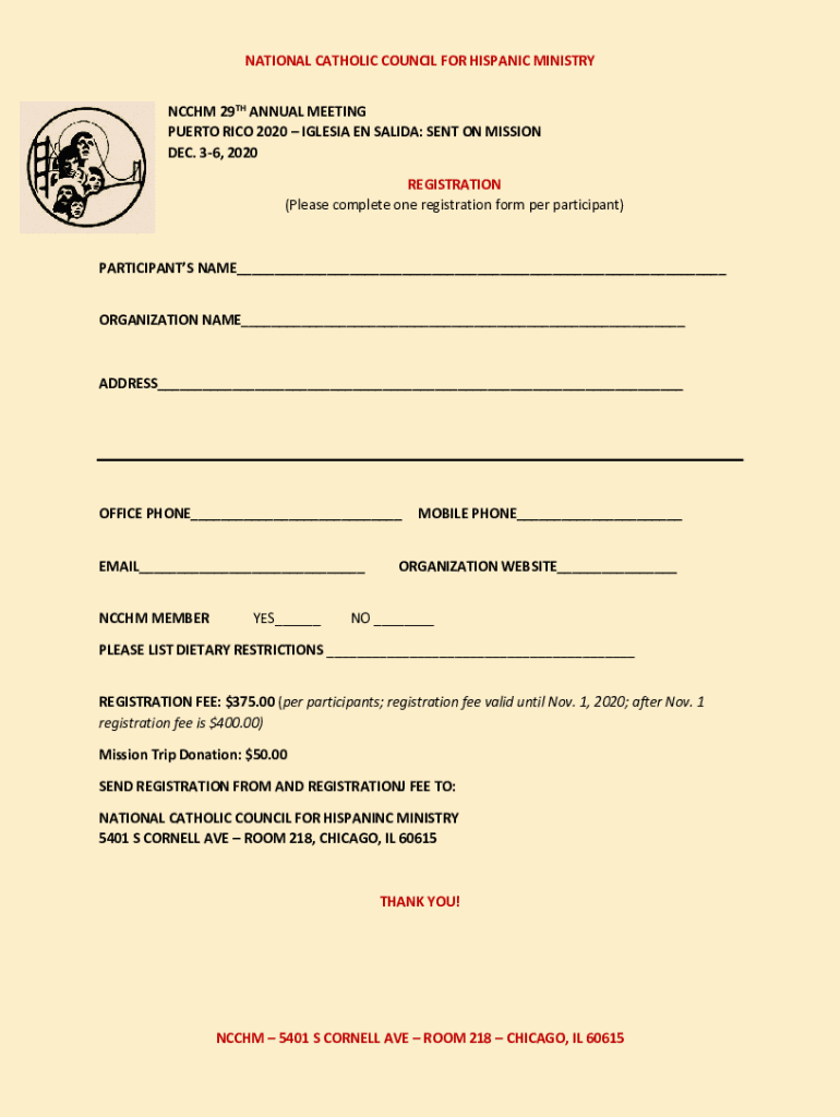NATIONAL CATHOLIC COUNCIL FOR HISPANIC MINISTRY NC CHM 29TH ANNUAL MEETING PUERTO RICO 2020 IGLESIAS EN SALIVA: SENT ON MISSION DEC. 36, 2020 REGISTRATION (Please complete one registration form per