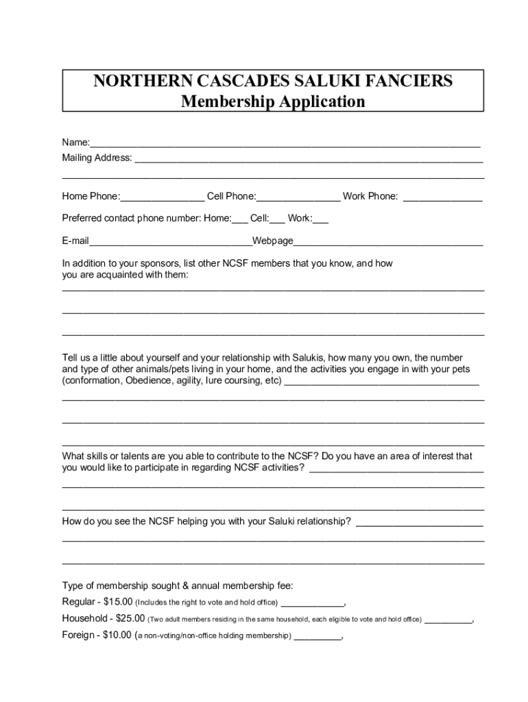 Get the free NORTHERN CASCADES SALUKI FANCIERS Membership Application