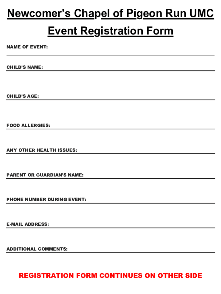 Newcomers Chapel of Pigeon Run UMC Event Registration Form NAME OF EVENT: CHILD IS NAME:CHILD IS AGE:FOOD ALLERGIES:ANY OTHER HEALTH ISSUES:PARENT OR GUARDIAN IS NAME:PHONE NUMBER DURING EVENT:EMAIL