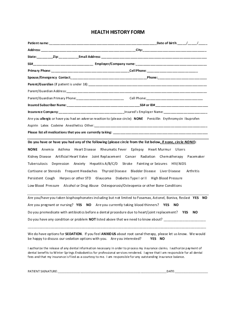 HEALTH HISTORY FORM Patient name: Date of birth: / / Address: City: State: Zip: Email Address: SS# Employer/Company name: Primary Phone: Cell Phone: Spouse/Emergency Contact Phone: Parent/Guardian