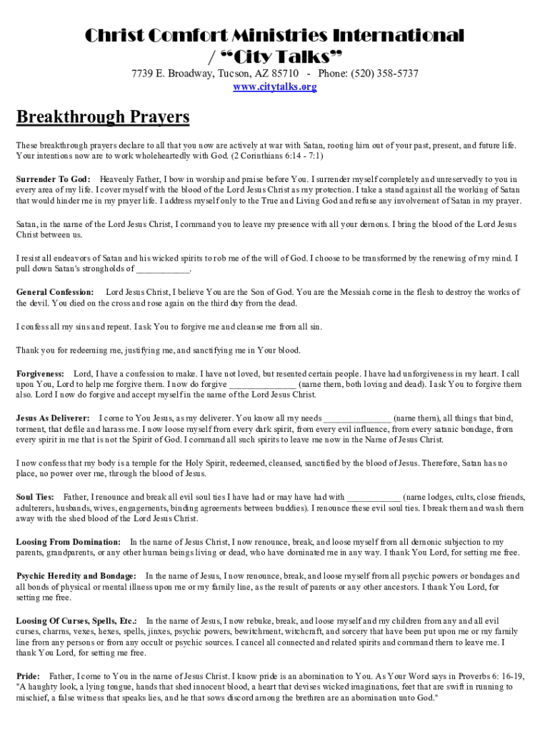 Christ Comfort Ministries International / City Talks 7739 E. Broadway, Tucson, AZ 85710 Phone: (520) 3585737 www.citytalks.orgBreakthrough Prayers These breakthrough prayers declare to all that you