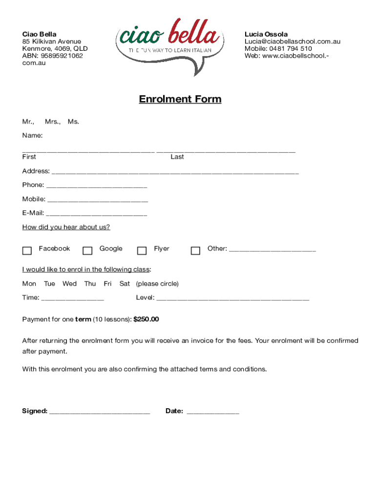 Ciao Bell 85 Killian Avenue Kenmore, 4069, QLD ABN: 95895921062com. Lucia Os sol Lucia ciaobellaschool.com.AU Mobile: 0481 794 510Web: www.ciaobellschool. Enrollment Form Mr., Mrs., Ms. Name: FirstLastAddress: