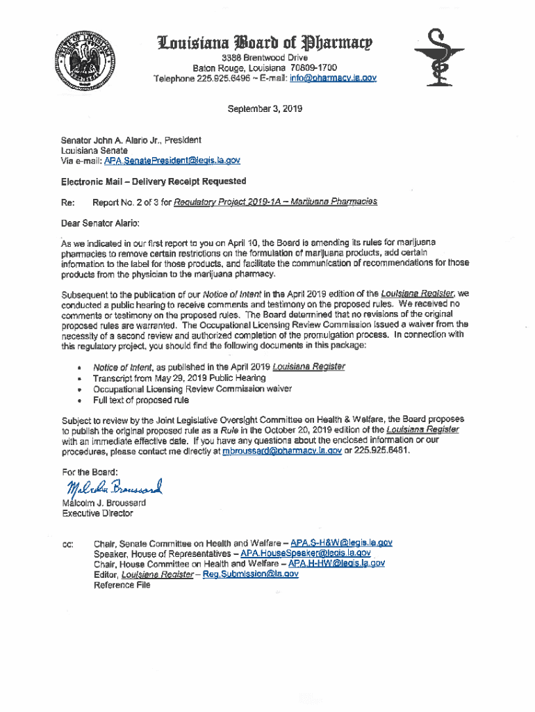 Louisiana Work of 39jjarmatp 3388 Brentwood Drive Baton Rouge, Louisiana 708091700 Telephone 22&925.6496 Email: info(pharmacy.la.gov September 3,2019Senator John A. Alaric Jr., President Louisiana