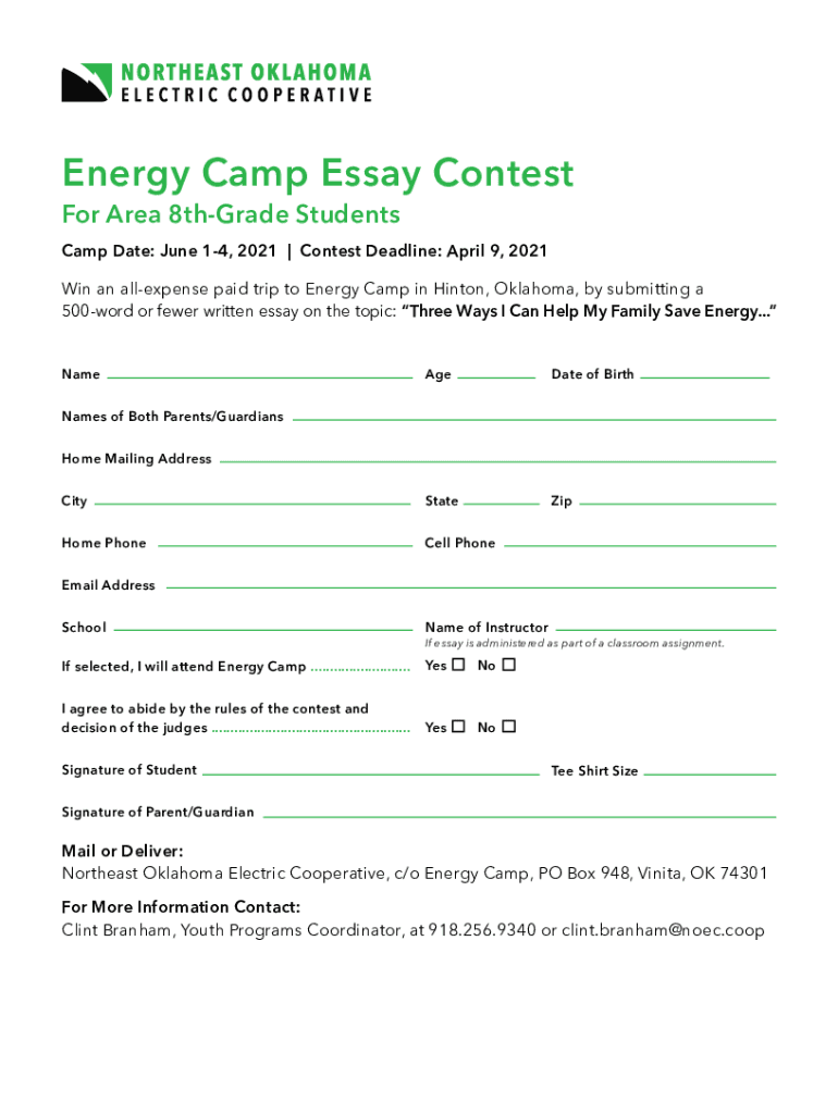 Energy Camp Essay Contest For Area 8thGrade Studentship Date: June 14, 2021, Contest Deadline: April 9, 2021, Win an all expense paid trip to Energy Camp in Hinton, Oklahoma, by submitting a 500word
