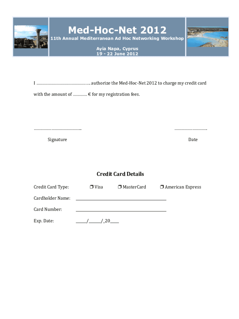 Mediocre 2012 11th Annual Mediterranean Ad Hoc Networking Workshop Asia Napa, Cyprus 19 22 June 2012 I.authorizetheMedHocNet2012tochargemycreditcard withtheamountofformyregistrationfees. .