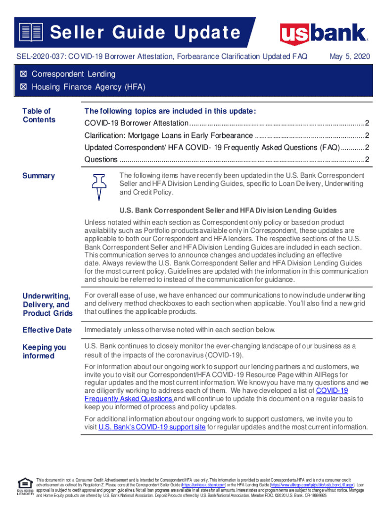 Seller Guide Update SEL2020037: COVID-19 Borrower Attestation, Forbearance Clarification Updated FAQ May 5, 2020, Correspondent Lending Housing Finance Agency (HF) Table of Contents following topics