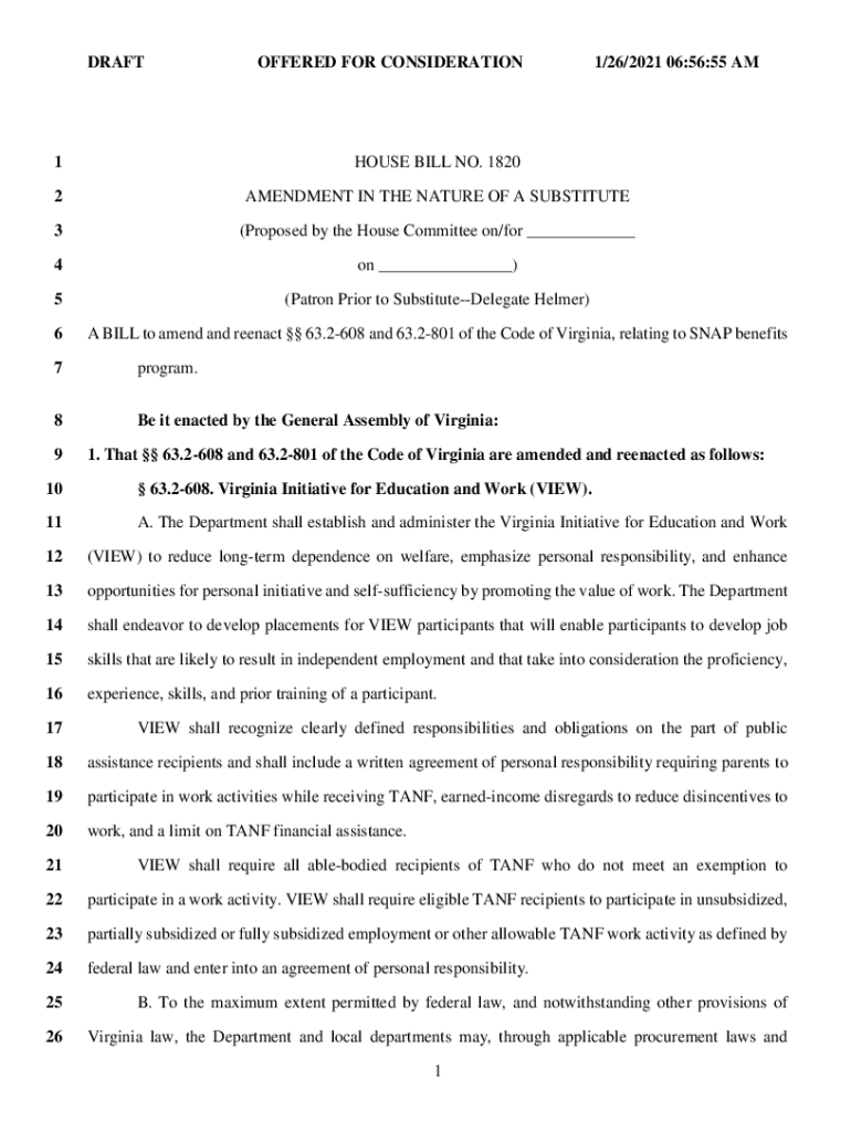 DRAFTOFFERED FOR CONSIDERATION1/26/2021 06:56:55 AM1HOUSE BILL NO. 18202AMENDMENT IN THE NATURE OF A SUBSTITUTE3(Proposed by the House Committee on/for 4on)5(Patron Prior to SubstituteDelegate Hélmer)6A