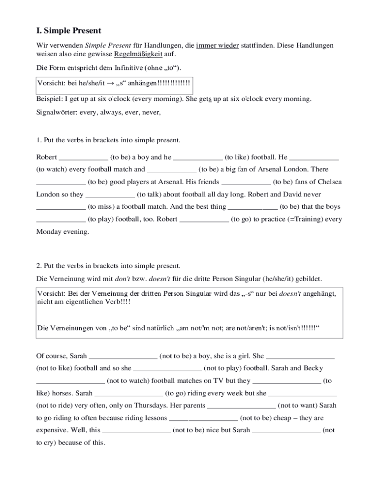 I. Simple Present WIR Vermeulen Simple Present for Handling, die dimmer wider stattfinden. Dies Handling waken also and gooiest Regelmigkeit AUF. Die Form entspricht them Infinitive (one to). Borscht: