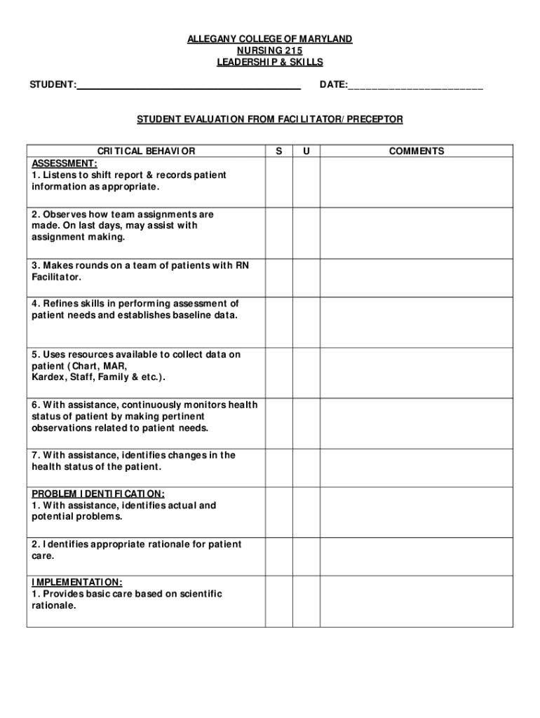 ALLEGING COLLEGE OF MARYLAND NURSING 215 LEADERSHIP & SKILLS STUDENT: DATE: STUDENT EVALUATION FROM FACILITATOR/PRECEPTOR CRITICAL BEHAVIOR ASSESSMENT: 1. Listens to shift report & records patient