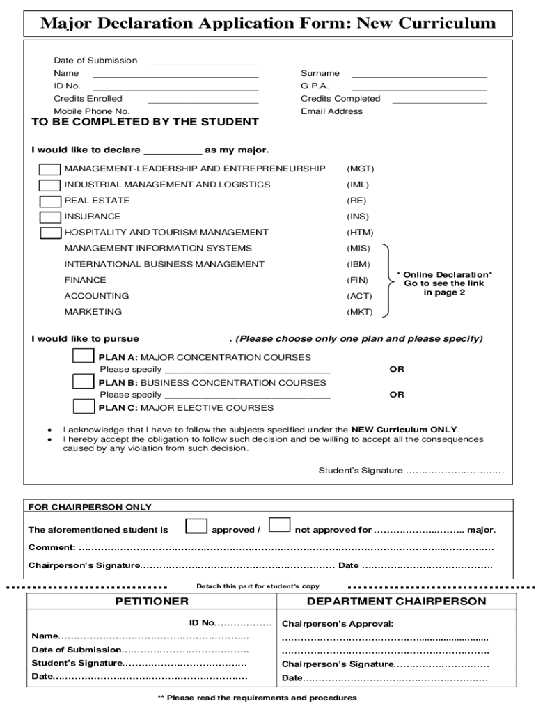 Major Declaration Application Form: New Curriculum Date of Submission NameSurnameID No. G.P.A. Credits EnrolledCredits Completed Mobile Phone No. Email Address TO BE COMPLETED BY THE STUDENT I would