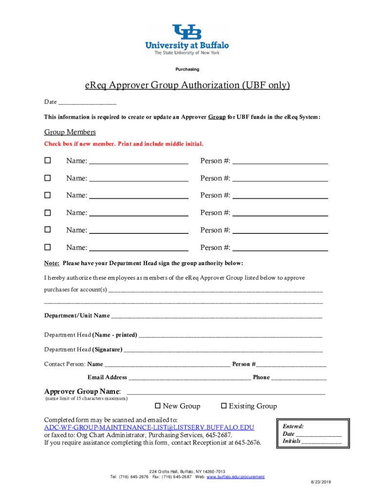 PurchasingeReq Approver Group Authorization (UHF only) Date This information is required to create or update an Approver Group for UHF funds in the freq System:Group Members Check box if new member.