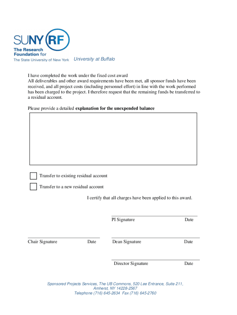 University at Buffalo have completed the work under the fixed cost award # Project #
