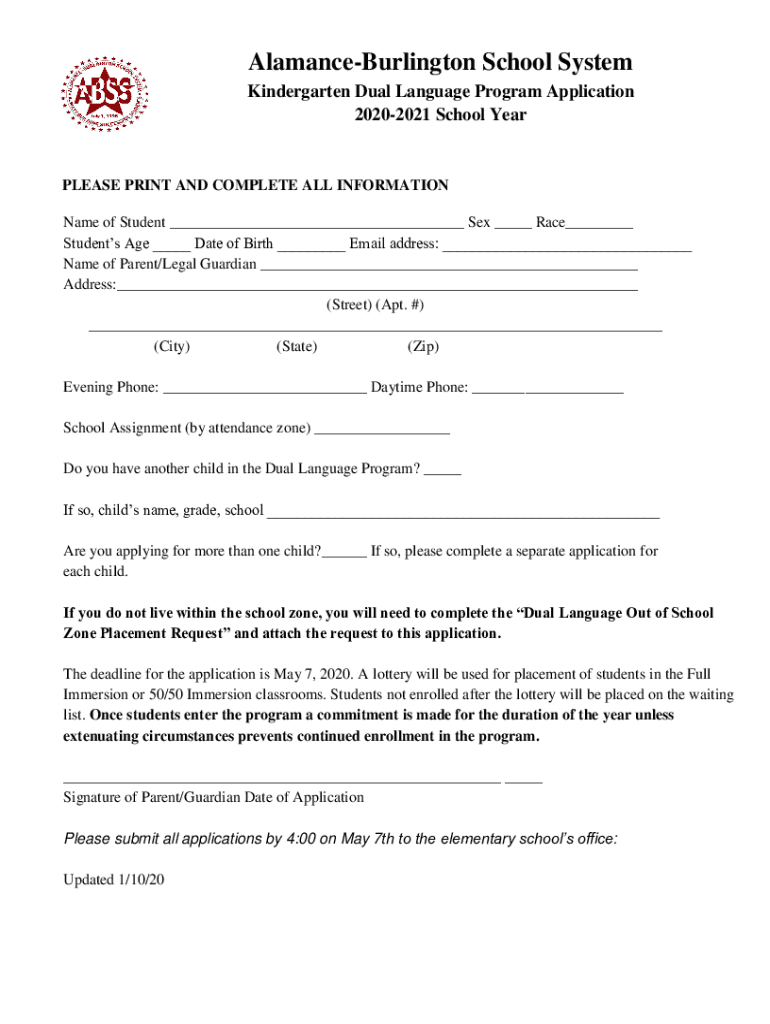 AlamanceBurlington School System Kindergarten Dual Language Program Application 20202021 School Release PRINT AND COMPLETE ALL INFORMATION Name of Student Sex Race Students Age Date of Birth Email