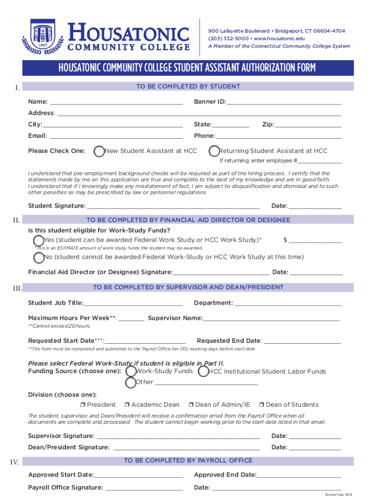 900 Lafayette Boulevard Bridgeport, CT 066044704 (203) 3325000 www.housatonic.edu A Member of the Connecticut Community College SystemHOUSATONIC COMMUNITY COLLEGE STUDENT ASSISTANT AUTHORIZATION FORM