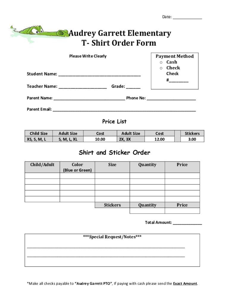Date: Audrey Garrett Elementary Shirt Order Repayment Method Cash CheckCheck# This Photo by Unknown Author is licensedPlease Write ClearlyStudent Name: Teacher Name: Grade: Parent Name: Phone No: