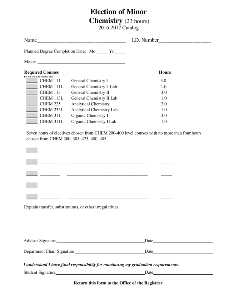 Election of Minor Chemistry (23 hours) 20162017 Catalog Name I.D. Number Planned Degree Completion Date: Mo. Yr. Major: Required CoursesHoursDo not write in shaded area CHEM 111 CHEM 111L CHEM 113