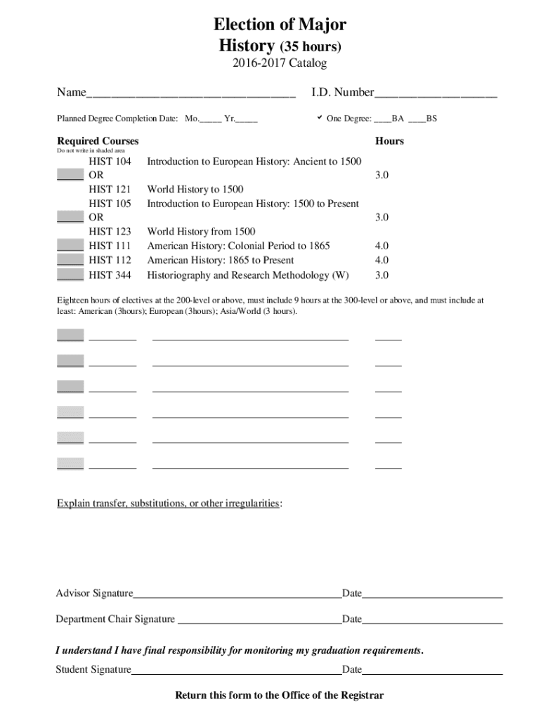 Election of Major History (35 hours) 20162017 Catalog Name Planned Degree Completion Date: Mo. Yr. I.D. Number One Degree: BA Required CoursesHoursDo not write in shaded area HIST 104 OR HIST 121