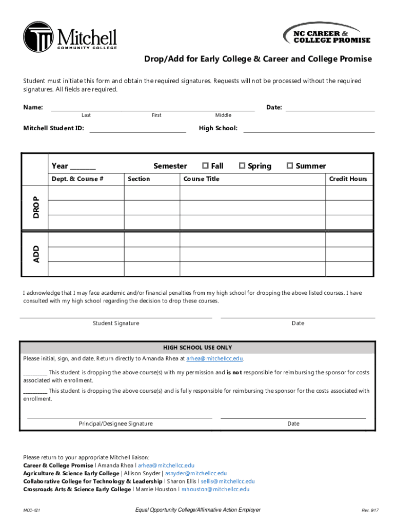 Drop/Add for Early College & Career and College Promise Student must initiate this form and obtain the required signatures. Requests will not be processed without the required signatures. All fields