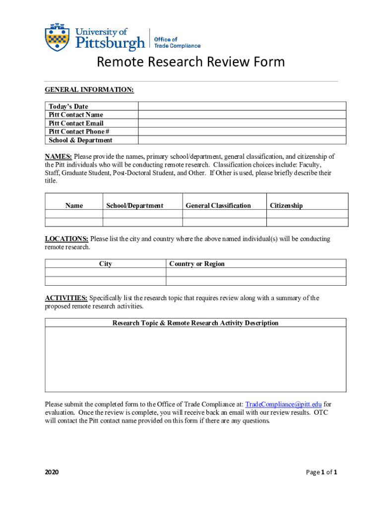 Remote Research Review Form GENERAL INFORMATION: Today's Date Pitt Contact Name Pitt Contact Email Pitt Contact Phone # School & Department NAMES: Please provide the names, primary school/department,
